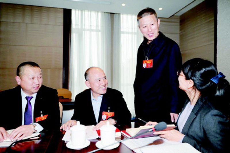 3月9日,山東代表團周建軍(左一(yī))、周洪江(右二)等代表討論宮明傑代表(左二)提出的提高經(jīng)濟(jì)作物種植機(jī)械化(huà)程度的建議。