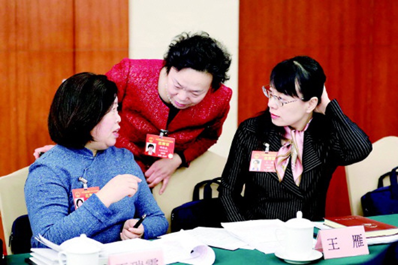 山東代表團代表胡桂花(中)、王瑞霞(左(zuǒ))、王(wáng)雁,討論支持民營企業發展的政策舉(jǔ)措如何落地落實。(轉自《大眾日報》手機客戶端)