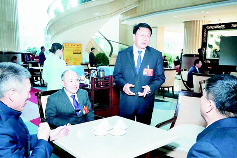 3月12日,李登(dēng)海(站立者)、宮明傑等山東代(dài)表團代表討論有關知識產權(quán)保護的話題,認為應把對新品(pǐn)種的保護提升到法律層(céng)麵,為發展現代種業保駕護(hù)航。(轉自《大(dà)眾日報》手機客戶端)